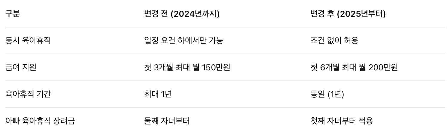 기존에는 부부가 동시에 육아휴직을 사용하는 것이 제한적이었지만, 2025년부터는 모든 근로자 부부가 동시에 육아휴직을 사용할 수 있도록 전면 허용됩니다.